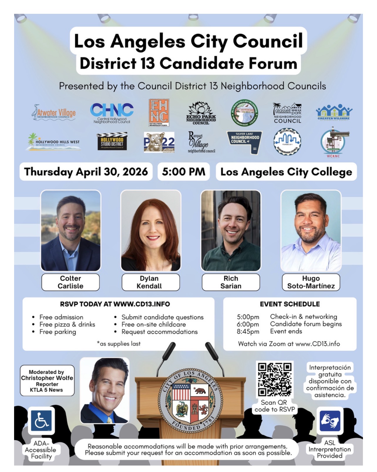 The Los Angeles City Council District 13 Candidate Forum is happening Thursday, April 30 at 5:00pm at Los Angeles City College, 855 N. Vermont Avenue, Los Angeles California 90029.